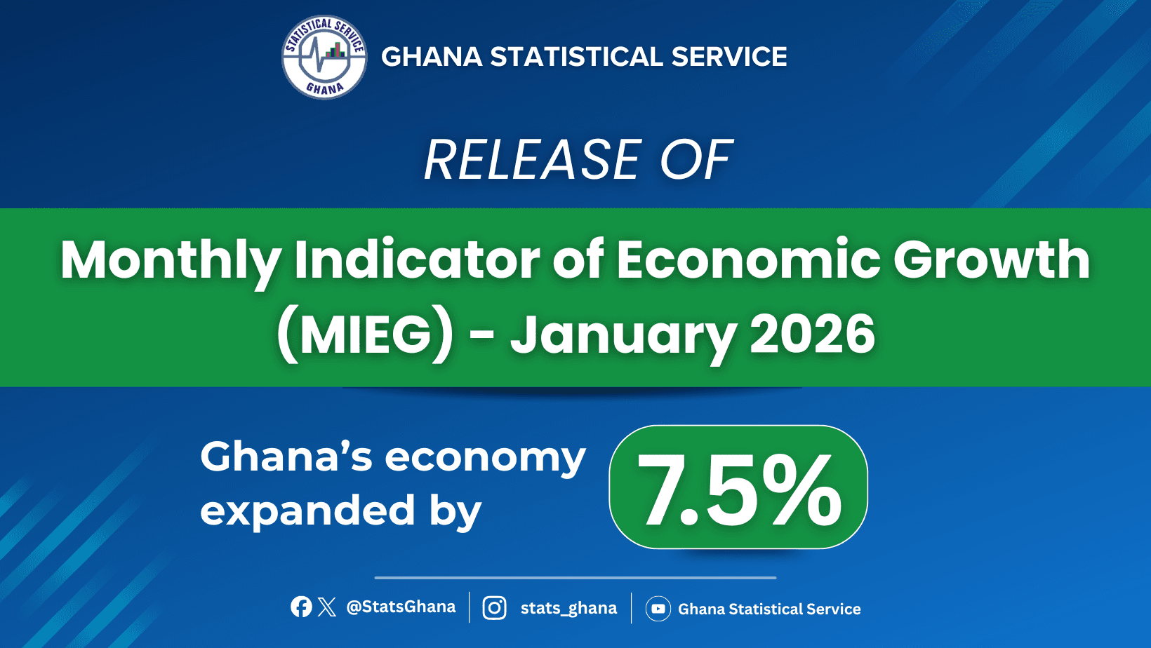 Presents Ghana's 2025 Q4 GDP results, 2025 Annual GDP Estimates, and 2025 MIEG highlights for tracking overall economic performance.